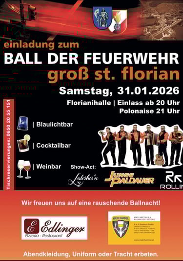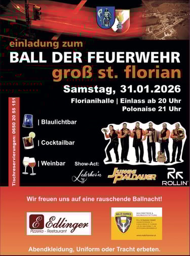 Am 31. Jänner 2026 ist es wieder so weit – der traditionelle Feuerwehrball Groß St. Florian steht vor der Tür. Nach 2024 feiern wir erneut in der Disco, mit guter Musik, stimmungsvoller Atmosphäre und vielen bekannten Gesichtern. Ich freue mich auf einen schönen Abend mit euch.